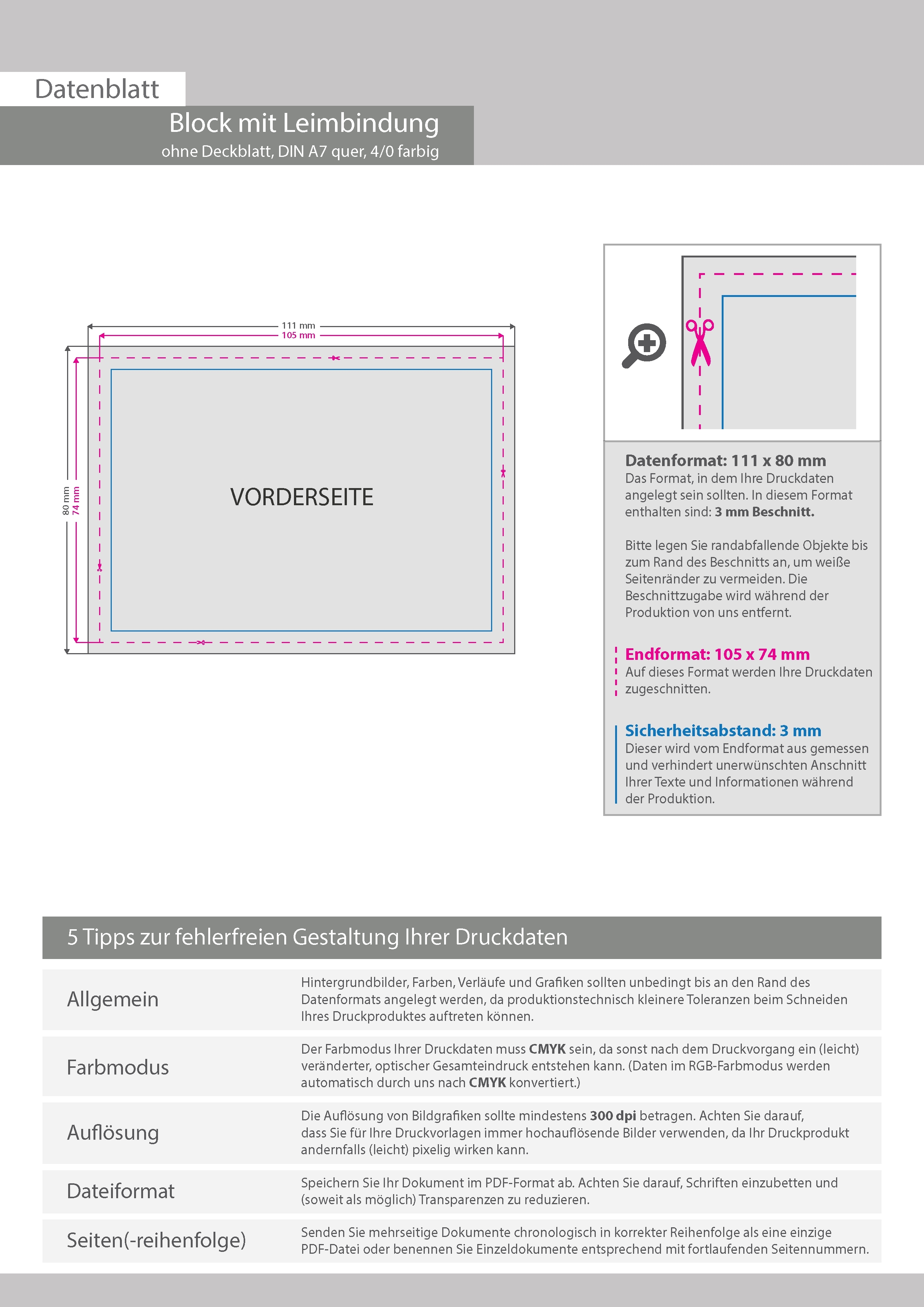 Block mit Leimbindung, DIN A7 quer, 10 Blatt, 4/0 farbig einseitig bedruckt