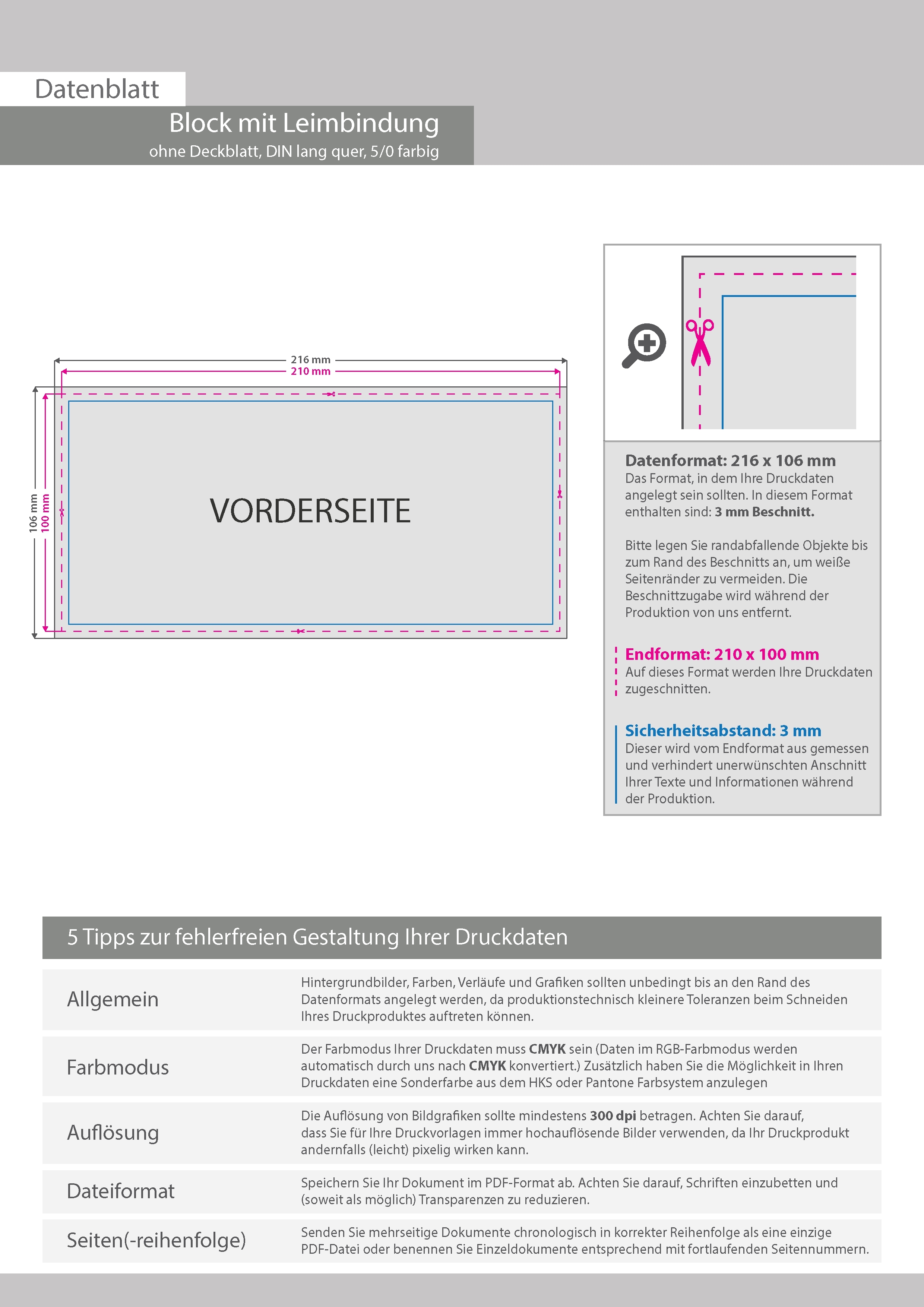 Block mit Leimbindung, DIN lang quer, 25 Blatt, 5/0 farbig einseitig bedruckt (CMYK 4-farbig + 1 Sonderfarbe HKS oder Pantone)