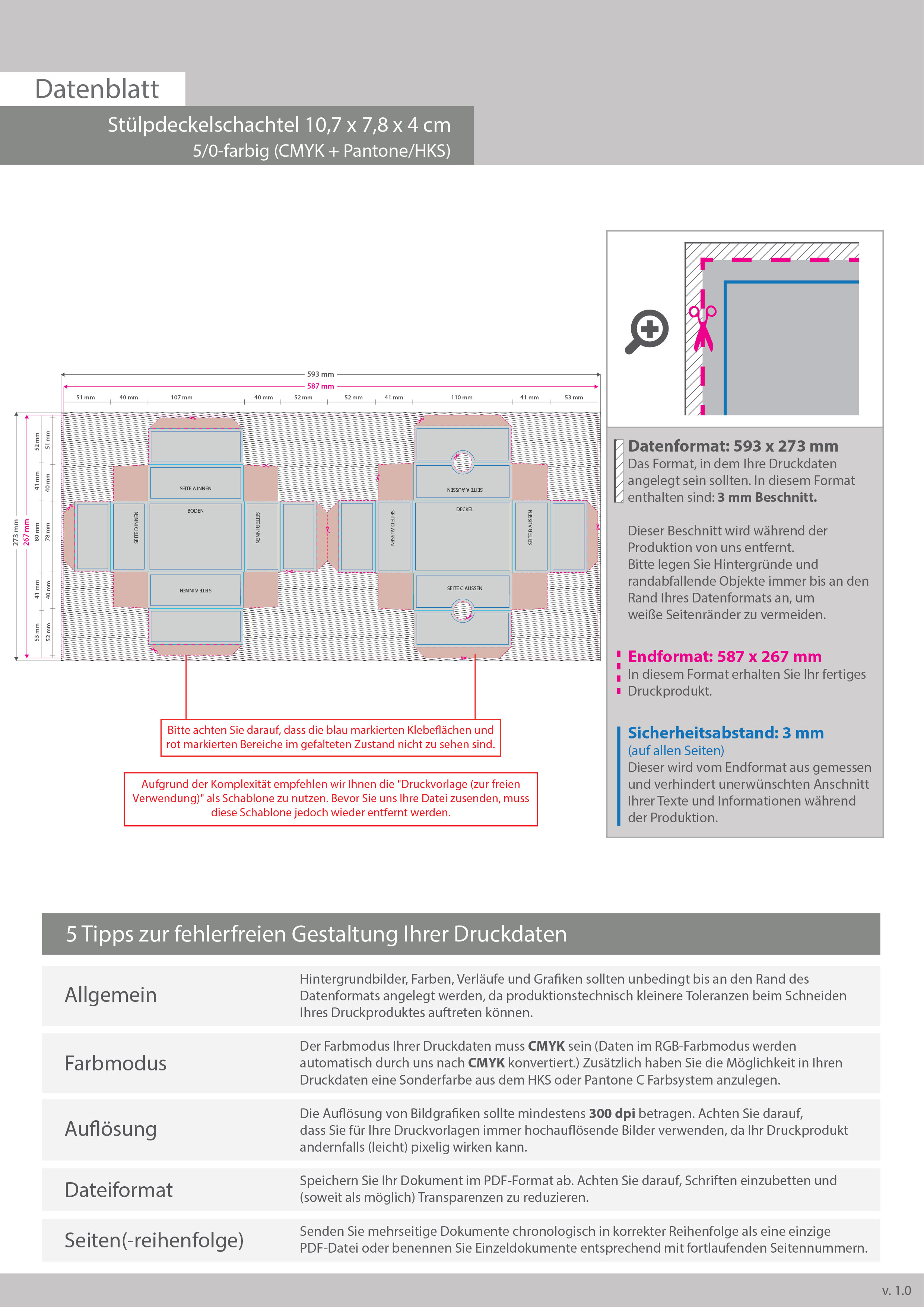 Stülpdeckelschachtel (10,7 x 7,8 x 4 cm), einseitig bedruckt 5/0-farbig (CMYK + Sonderfarbe)