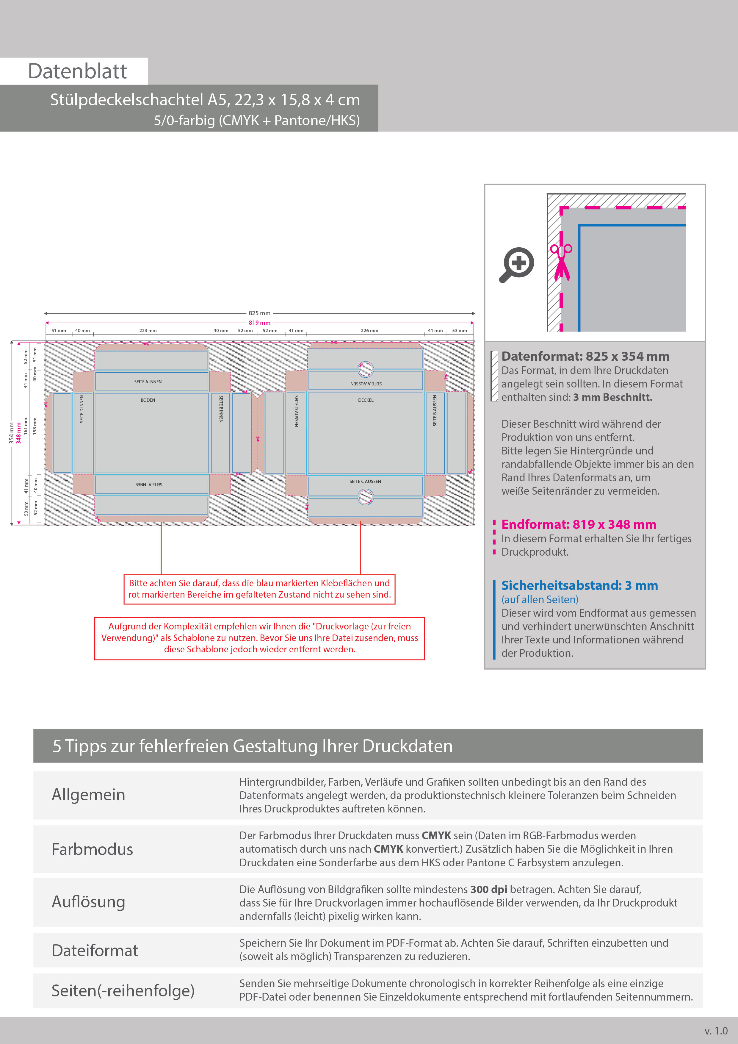 Stülpdeckelschachtel A5 (22,3 x 15,8 x 4 cm), einseitig bedruckt 5/0-farbig (CMYK + Sonderfarbe)