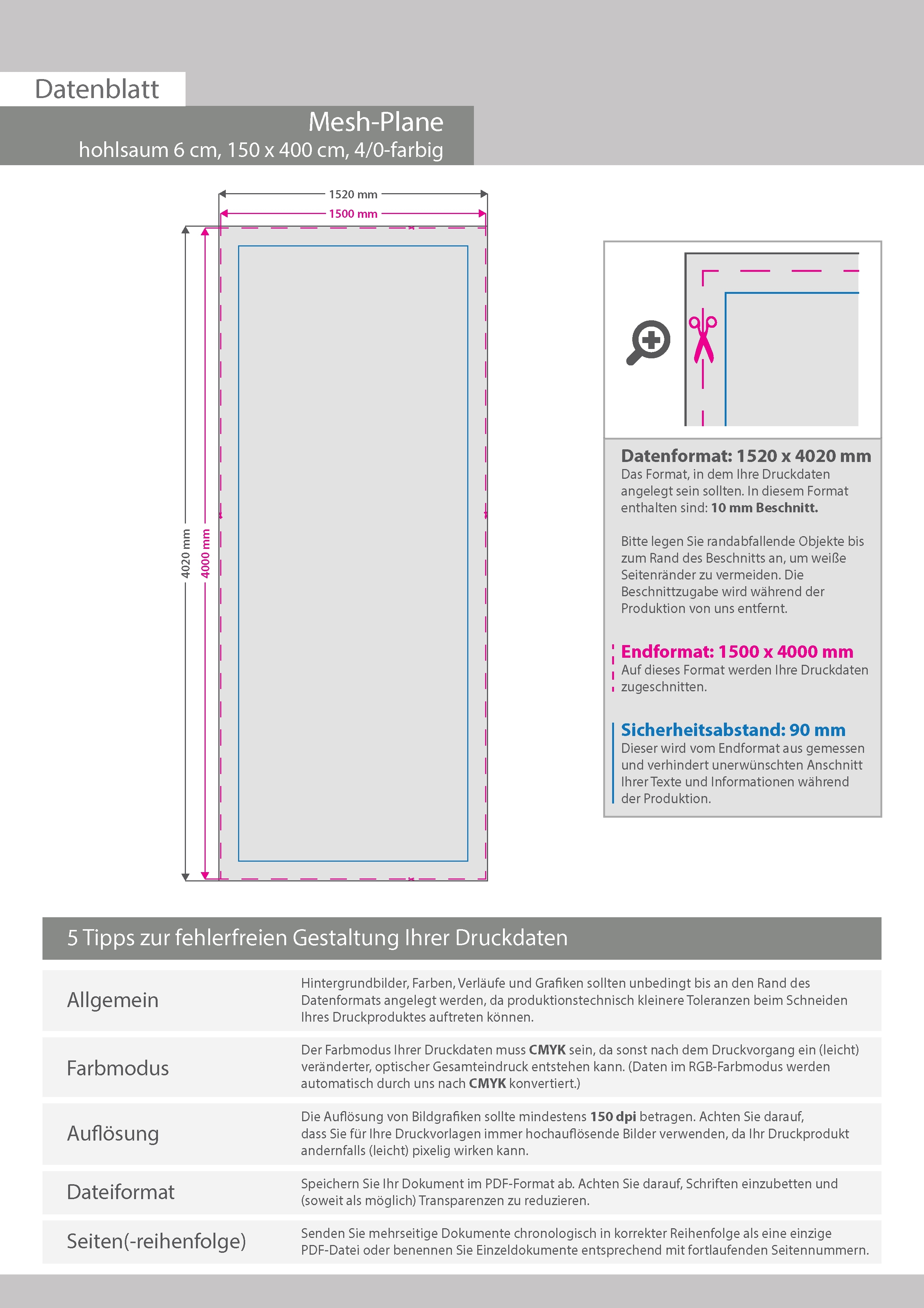 Hochwertige Mesh-Plane 150 x 400 cm, 4/0-farbig bedruckt, Hohlsaum oben und unten (Durchmesser Hohlsaum 6,0 cm)